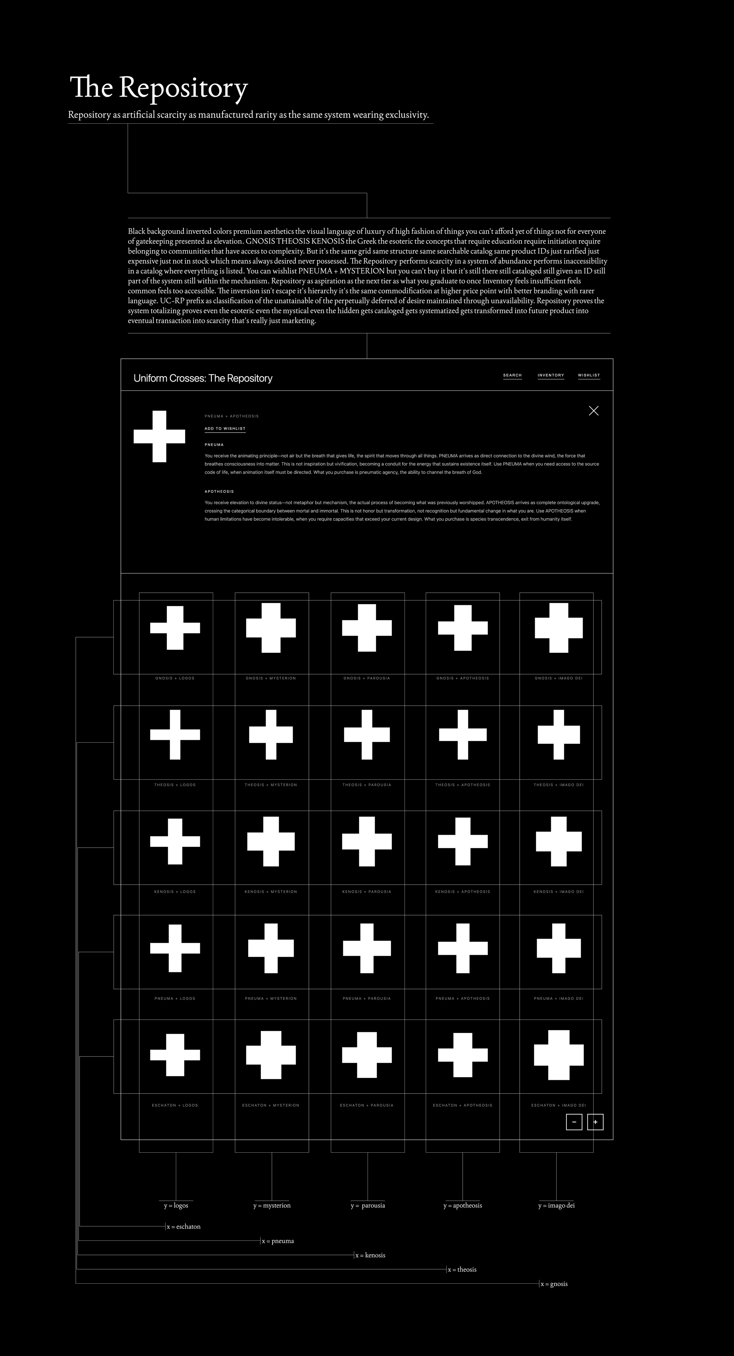 The Repository inverts the system—black background, white crosses, Greek theological terminology—presenting GNOSIS, THEOSIS, KENOSIS, PNEUMA, ESCHATON combined with LOGOS, MYSTERION, PAROUSIA, APOTHEOSIS, IMAGO DEI as rare, exclusive items "not currently in stock." These esoteric concepts require education, initiation, access to communities that possess theological sophistication. The Repository performs artificial scarcity within a system of total availability. Everything remains cataloged, searchable, assigned a product ID, but withheld. This is luxury branding applied to mysticism—the same commodification at a higher price point, accessibility replaced by aspiration.
