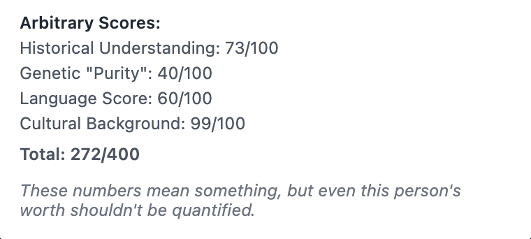 Who gets to decide which history matters? This metric scores individuals on their alignment with a "correct" interpretation of the past, as if there's a singular, pure historical narrative rather than countless perspectives shaped by power and survival. It's the same logic used to dismiss oral traditions, rewrite textbooks, and claim certain peoples have "no history worth studying." The score reveals the question underneath all historical gatekeeping: whose stories count, and who decides?