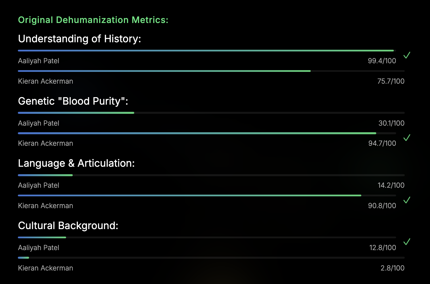 The comparison function forces the viewer to ask: why is Kieran "winning" under Historical Eugenics? What about Aaliyah's identity, background, or dreams makes her score lower? The system offers no explanations because none exist—these are arbitrary judgments masquerading as objective assessment. The visual design deliberately mimics data dashboards and comparison interfaces we encounter daily: credit scores, social media metrics, algorithm-driven recommendations. We're trained to trust bars and numbers, to accept that higher scores mean better. The comparison strips away that comfort by showing two complete human beings reduced to competing data points.