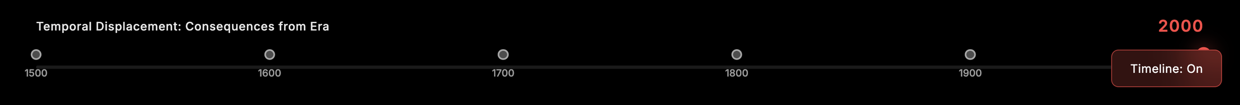 An optional timeline function, available only in View 2, allows users to scroll through different time periods from 1500 to 2000 in 100-year increments. This feature strips away historical context, placing all profiles on the same dehumanizing timeline. It reveals the uncomfortable truth that while the language changes—from "racial purity" to "risk assessment" to "predictive analytics"—the logic of categorization remains constant across centuries. The timeline function doesn't educate about historical differences; it collapses them, showing how systems of dehumanization simply rebrand while continuing to sort, exclude, and harm.