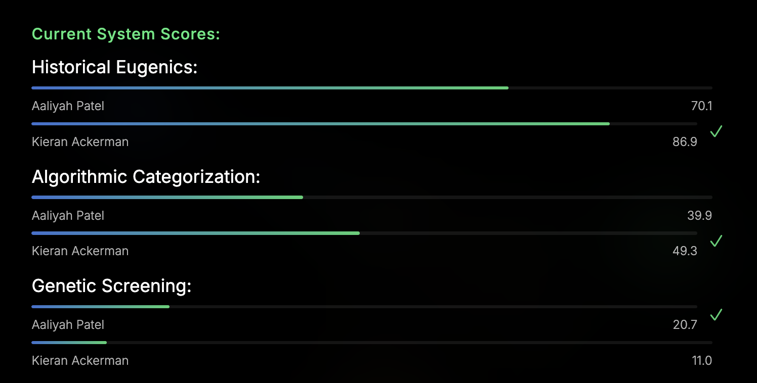 Below these narratives, the system assigns scores. The three categorization systems—Historical Eugenics, Algorithmic Categorization, and Genetic Screening—each render their judgment through color-coded bars. Aaliyah scores 70.1 under Historical Eugenics while Kieran scores 86.9, a green checkmark appearing beside his higher number as if proximity to eugenic ideals were an achievement. The bars grow and shrink, green checkmarks appear and disappear, numbers fluctuate—but what do any of these measurements mean?