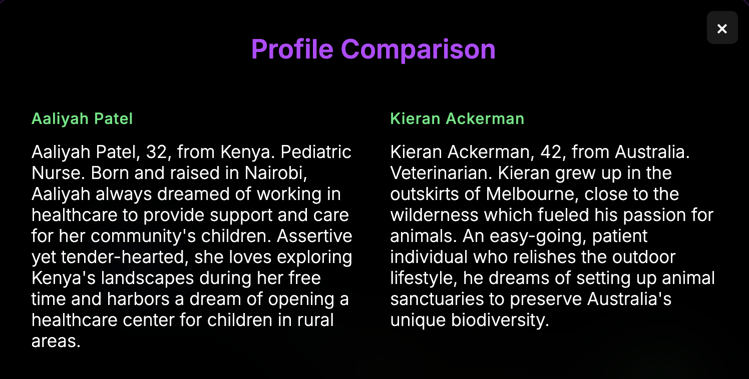 The comparison mode represents one of the project's most direct confrontations with categorization's violence. When activated, it places two individuals side by side, disregarding fictional or historical, random or evil, under the stark heading "Profile Comparison" in vivid magenta—a color that signals both visibility and alarm. Users see the full humanity of each person: Aaliyah Patel, 32, and Kieran Ackerman, 42: